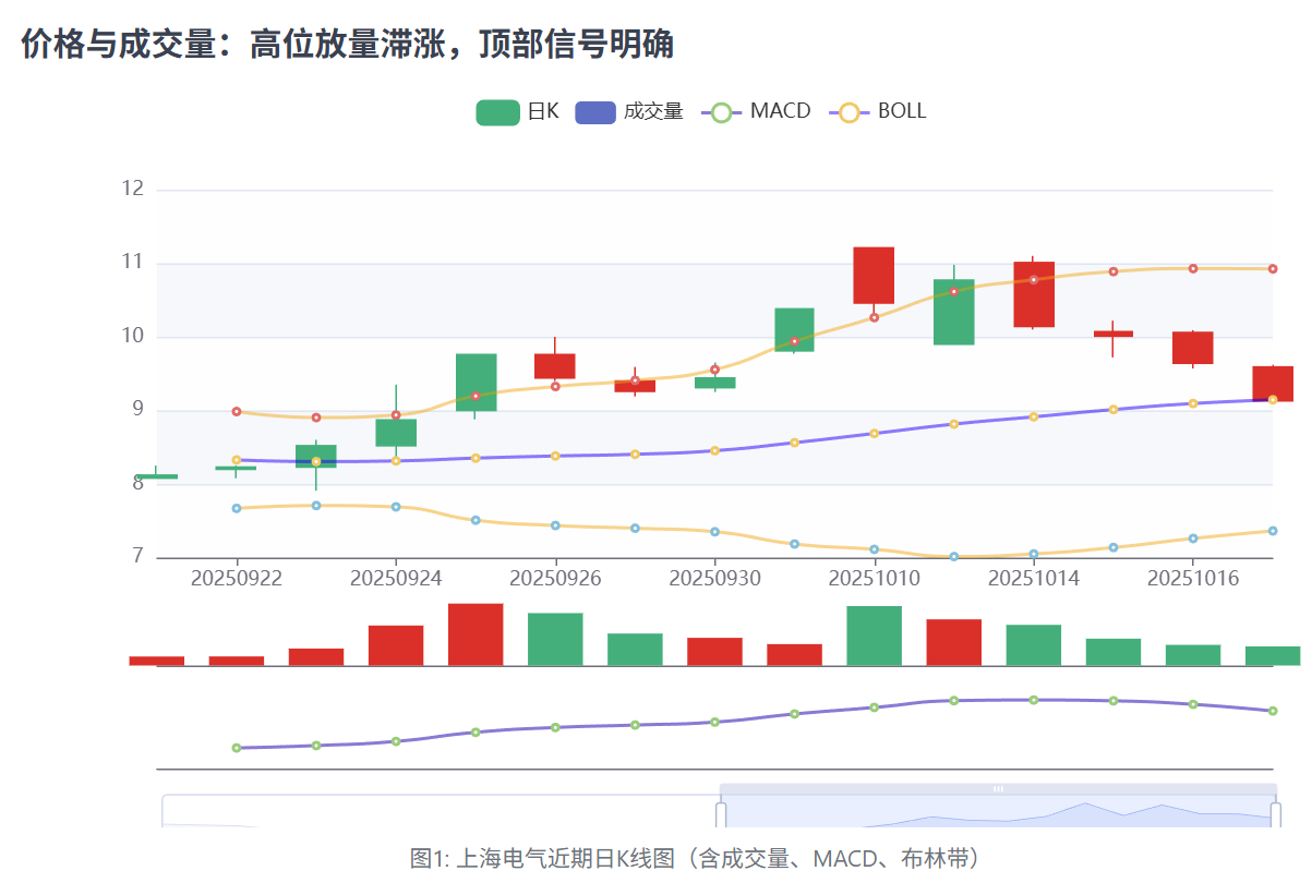 如图表所示,股价在10月9日、10日急剧放量后冲高回落,形成长上影线,是典型的多头力竭信号。随后的连续下跌确认了顶部的有效性。布林带上轨(橙色线)构成压力,股价跌破中轨(蓝色线)后,下跌趋势得到技术面确认。