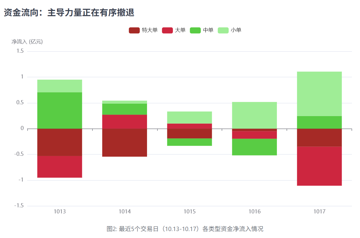 上图清晰地展示了主导资金(特大单、大单)与跟随资金(中单、小单)的行为背离。在股价下跌的5天里,特大单与大单均呈现持续、大规模的净流出,表明“聪明钱”正在坚决离场。而小单和中单在部分交易日甚至呈现净流入,符合散户投资者逆势操作的典型行为。当主导力量与跟随力量行为背离时,趋势延续的概率极高。