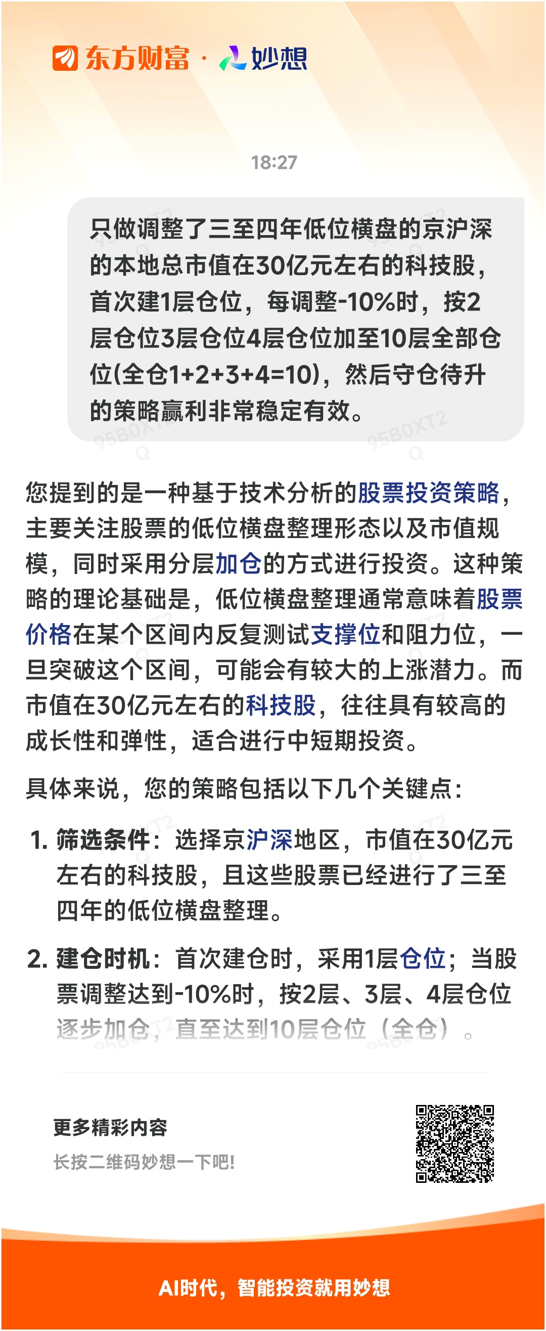 #@妙想,你怎么看?# 妙想一下:只做调整了三至四年低位横盘的京沪深的本地总市值在30亿元左右的科技股,首次建1层仓位,每调整-10%时,按2层仓位3层仓位4层仓位加至10层全部仓位(全仓1+2+3+4=10),然后守仓待升的策略赢利非常稳定有效。