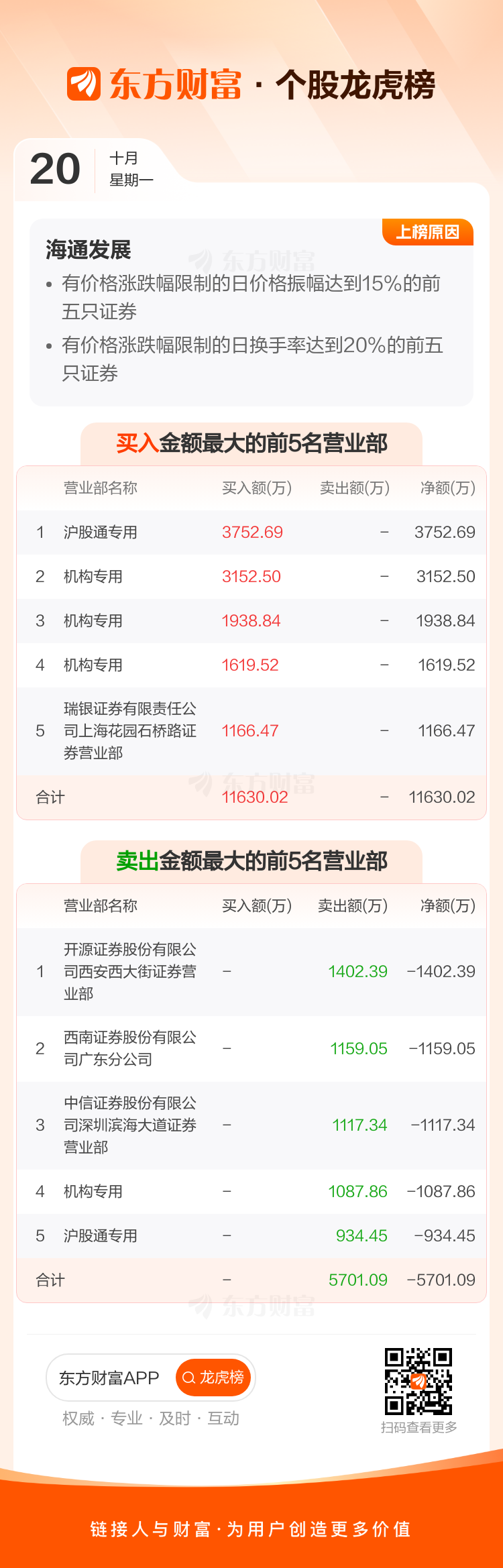 交易所2025年10月20日公布的交易公开信息显示,海通发展因成为有价格涨跌幅限制的日价格振幅达到15%的前五只证券、有价格涨跌幅限制的日换手率达到20%的前五只证券上榜。海通发展当日收报12.3元,涨跌幅9.63%,偏离值17.88%,换手率30.47%,成交额9.40亿。