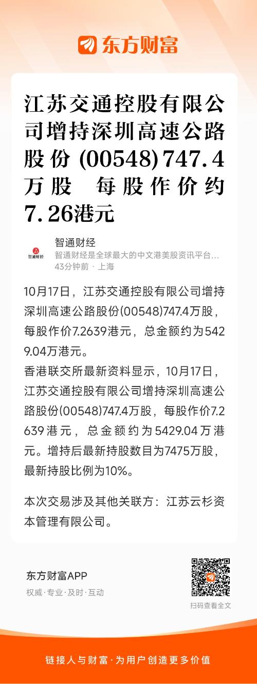 10月17日,江苏交通控股有限公司增持深圳高速公路股份(00548)747.4万股,每股作价7.2639港元,总金额约为5429.04万港元。