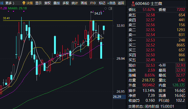 士兰微:与厦门国资合作,投资200亿建设高端模拟芯片项目,公司本身是功率半导体行业的领导者,覆盖面广,产品齐全,当前整体位置不高,周一炸板爆天量,关注今天能否分歧转一致,上方还有一个压力位33.4,盘中三种应对方案:一是开盘快速冲过33.4压力,结合盘口情况可能会小仓位跟进,二是收盘前能有效站在33.4上方会考虑尾盘小仓位跟进,三是低开的话回踩5天均线不破小仓位低吸。