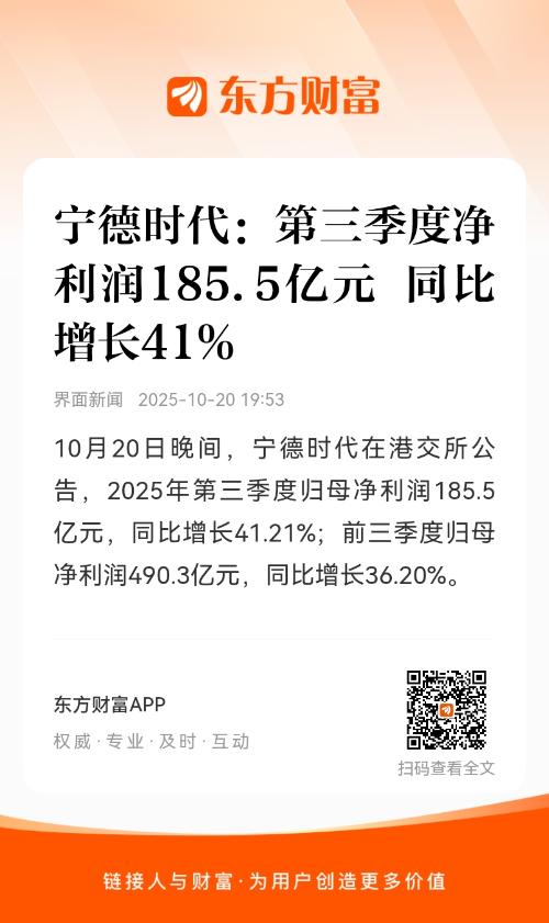 10月20日晚间,宁德时代在港交所公告,2025年第三季度归母净利润185.5亿元,同比增长41.21%;前三季度归母净利润490.3亿元,同比增长36.20%。