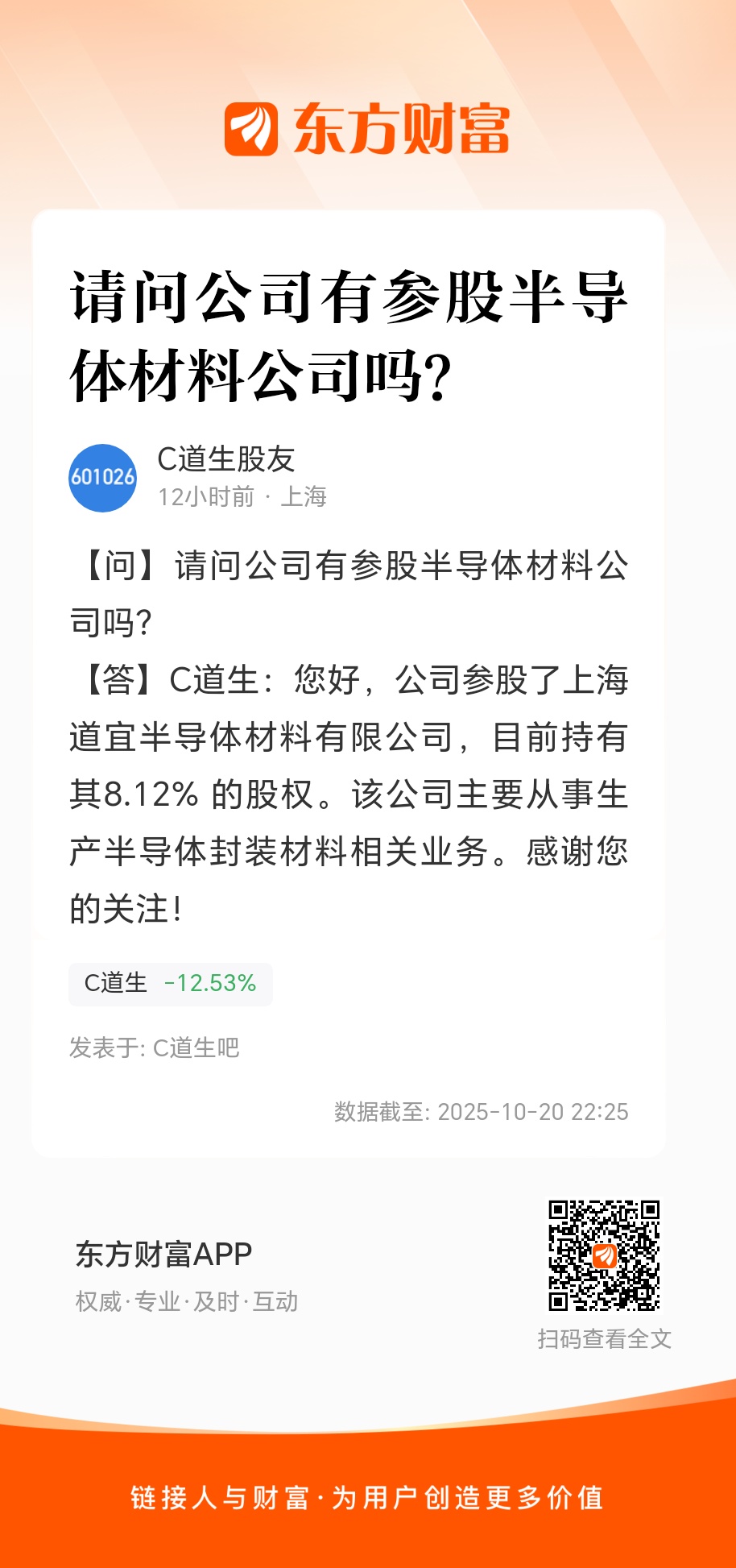 您好,公司参股了上海道宜半导体材料有限公司,目前持有其8.12% 的股权。该公司主要从事生产半导体封装材料相关业务。感谢您的关注!