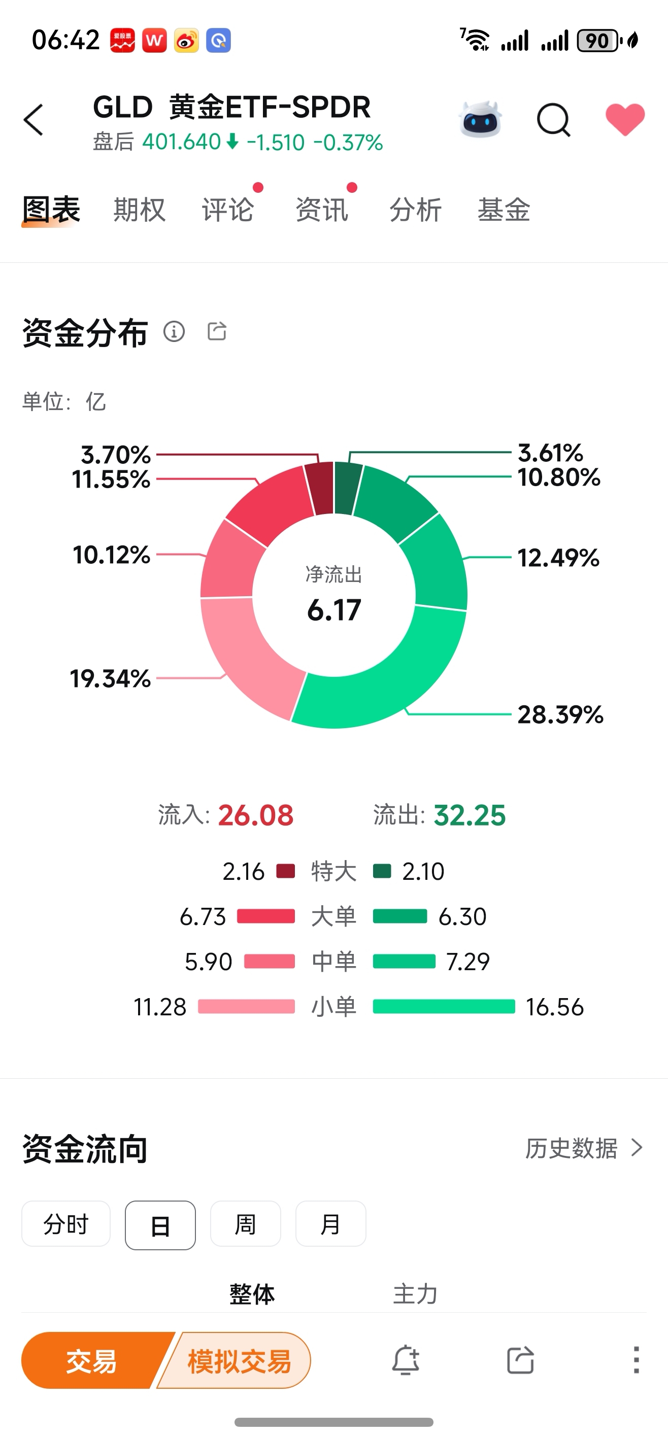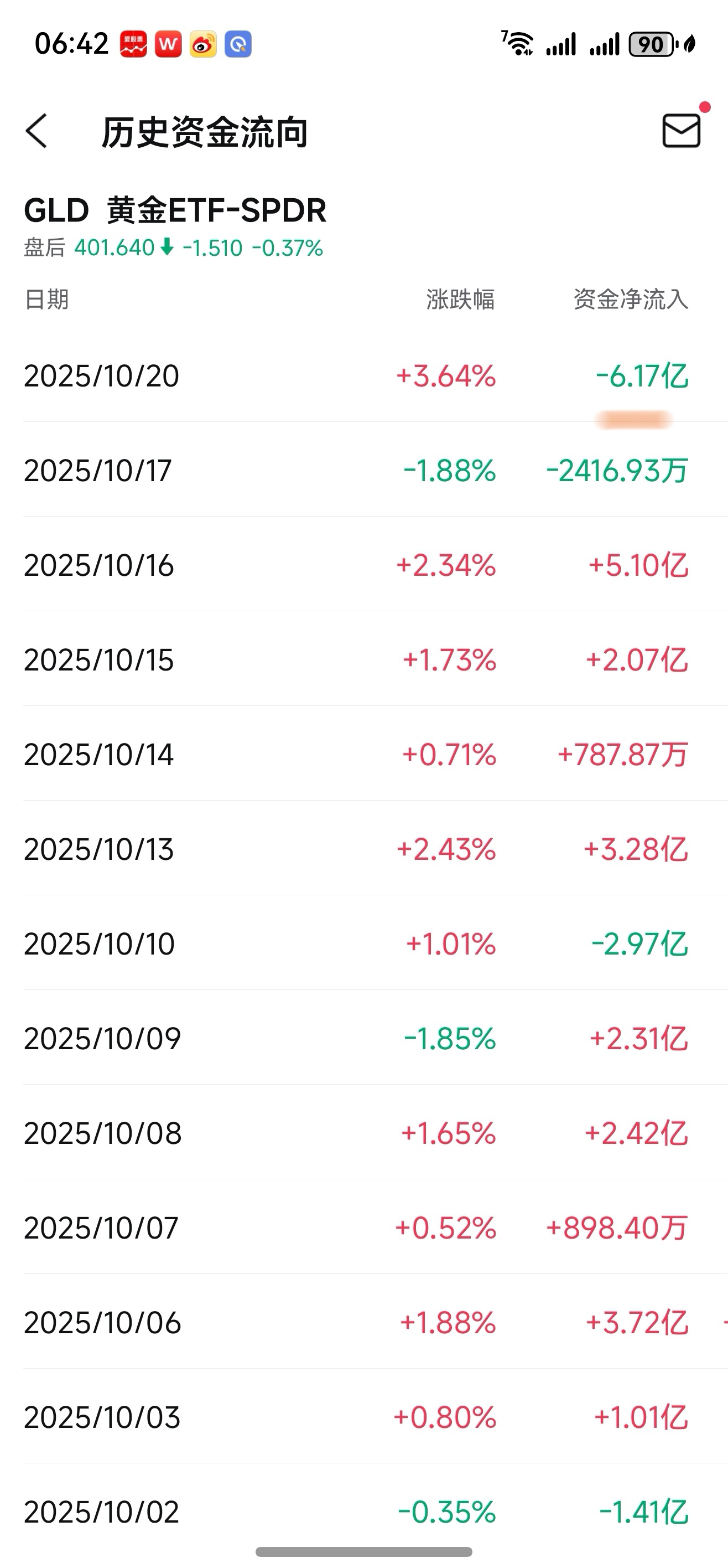 在今天早上,观察全球最大黄金ETF在昨天20日那天流出-6.17亿。