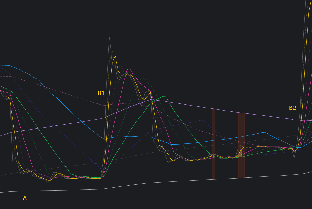 9月30日上午跌至下方阻力位(图中A点),空头未能突破,随即多头小周期动力开始启动,在窄幅区间(合力)内加速突破(方向),直至30日下午突破最上方阻力位(B1,买点),但之后受空头动力影响,再次回撤,于10月10日第二次突破(B2,买点),“空间”完全打开,主升浪开启。