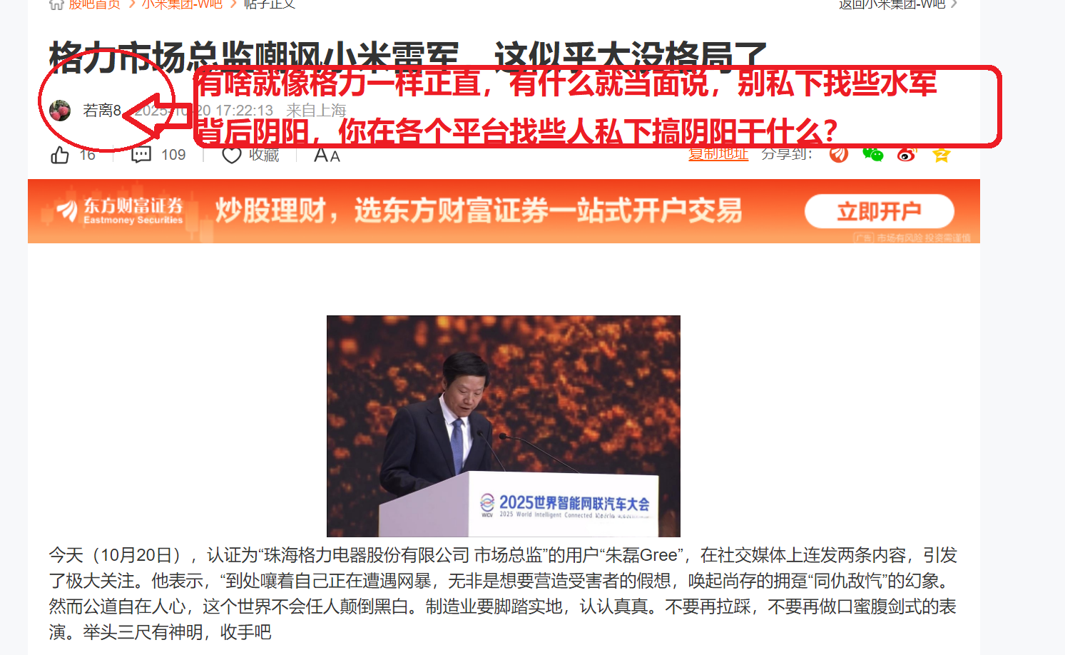 $格力电器(SZ000651)$$小米集团-W(HK|01810)$ 我倒要说反倒是小米雷军实在是太没有格局了,正人君子都是像董明珠和朱磊那样有什么当面说,这才是年轻人的榜样,哪像小米找些水军在各大平台发帖这样背后玩阴阳。。我就要说现在的年轻人都喜欢直来直去,都不喜欢这种当面光面堂皇,而私下找水军在背后说三道四的人,有啥你当面说啊,你找水军小喽啰背地里搞这些,有啥意思?