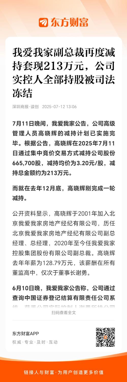 7月11日晚间,我爱我家公告,公司高级管理人员高晓辉的减持计划已实施完毕。根据公告,高晓辉在2025年7月11日通过集中竞价交易方式减持公司股份665,700股,减持均价为3.20元/股,减持总金额约为213万元。