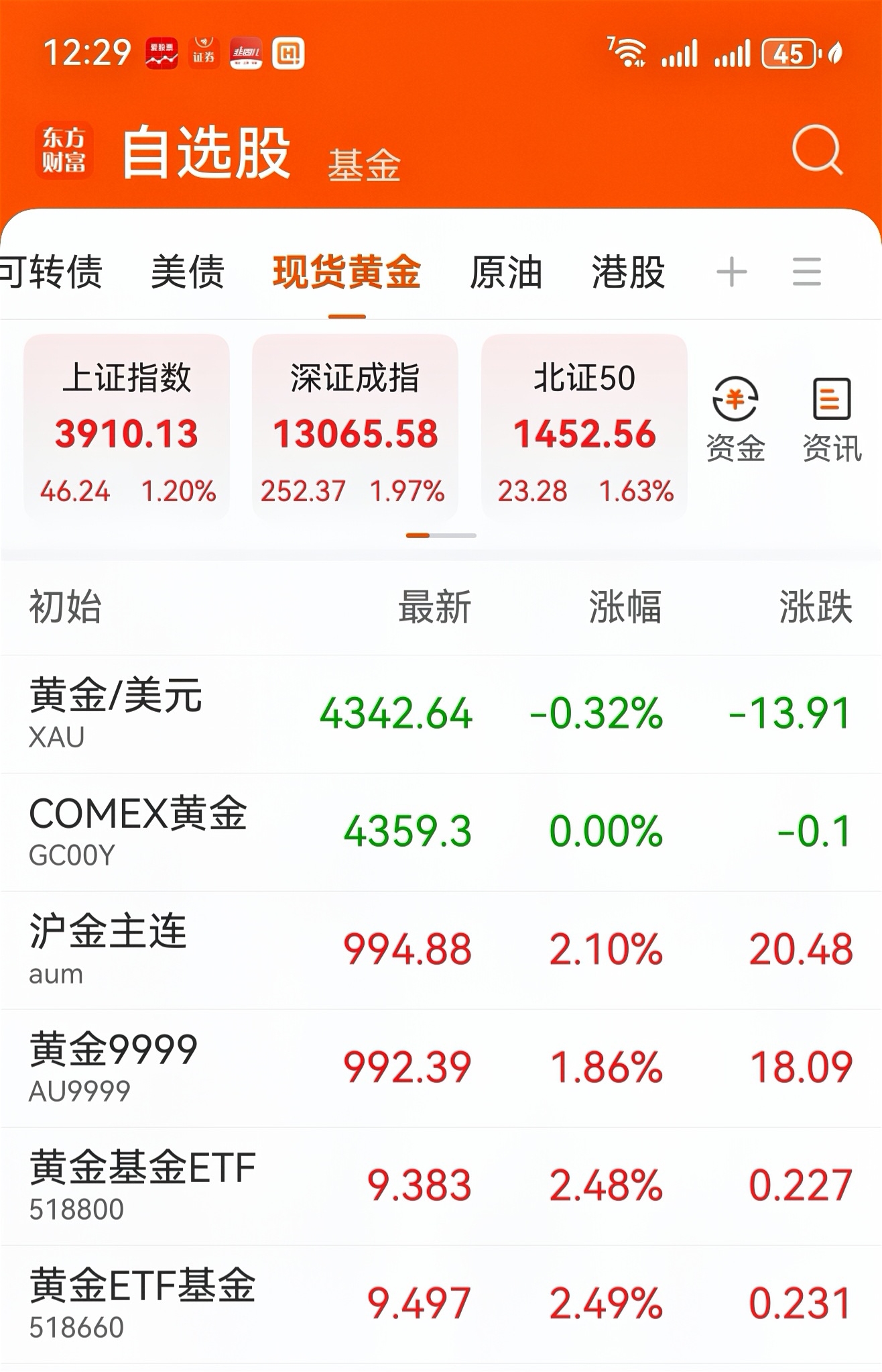 在今天中午12点29分,观察现货黄金是跌-0.32%