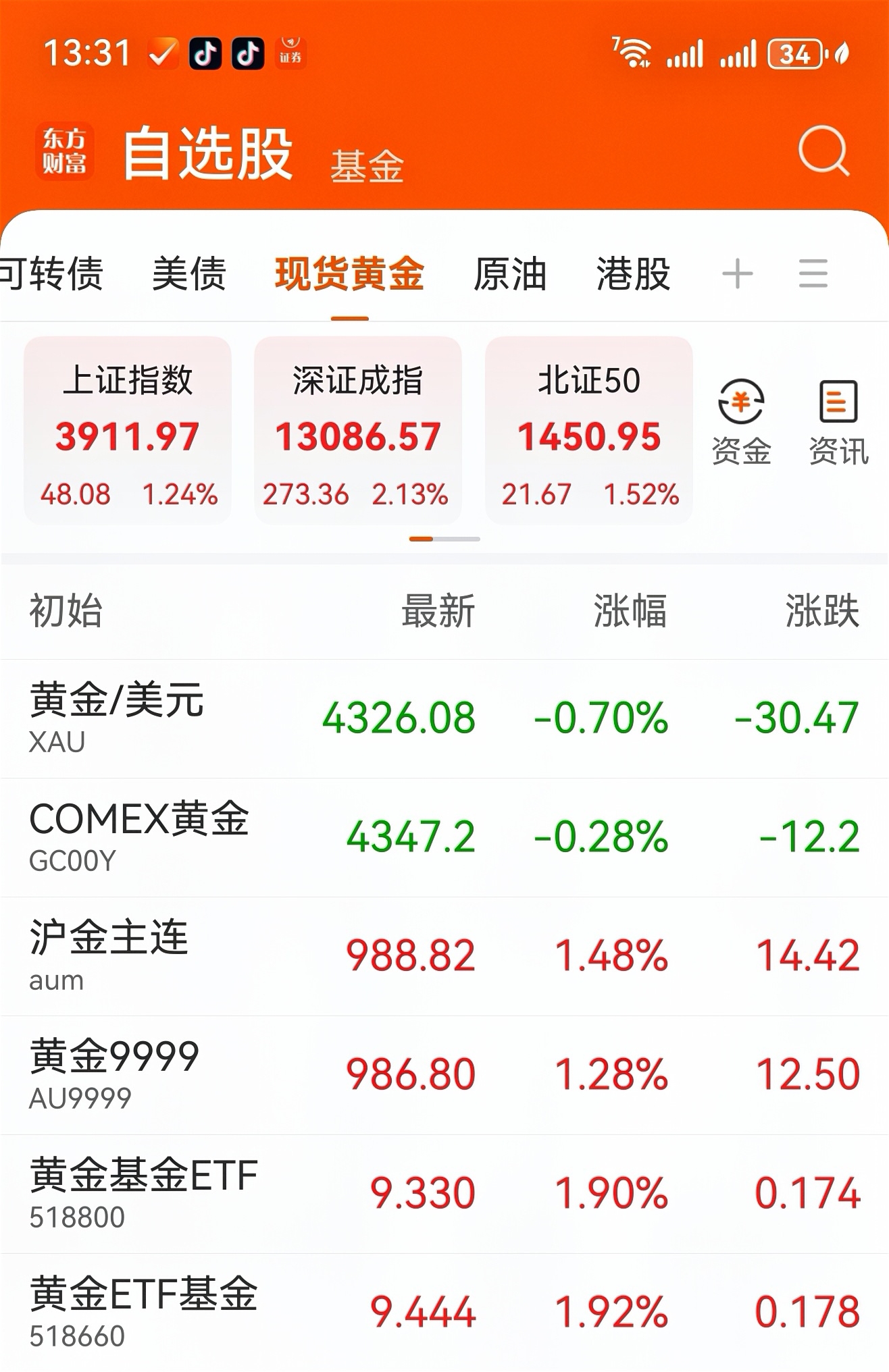 在今天下午13点31分,观察现货黄金在某各继续开盘之后,与昨天一样又再继续跳水变跌幅扩大了。与在目前,观察现货黄金是跌-0.70