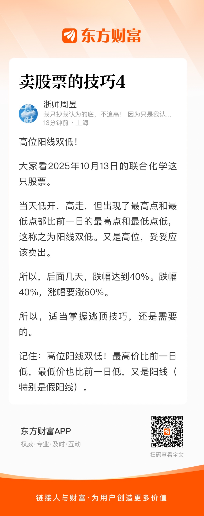 记住:高位阳线双低!最高价比前一日低,最低价也比前一日低,又是阳线(特别是假阳线)。