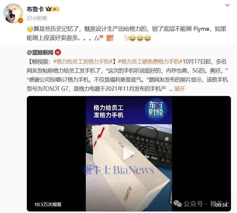 同时,魅族科技员工“布鲁卡”转发相关微博并发文称,“该机实为魅族设计生产给格力的机型,不过锁了底层不能刷Flyme系统。”