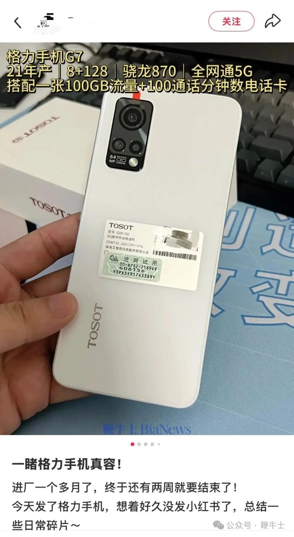 根据网友晒出的手机照片,预计该手机型号为TOSOT大松G7,是格力于2021年11月发布的手机。