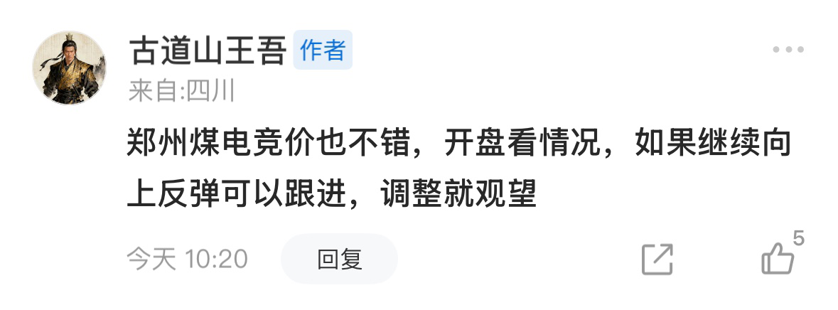 $郑州煤电(SH600121)$:公司是区域煤炭龙头,年产能近千万吨,智能化转型降本增效,叠加煤炭价格反弹预期与国资委背景下的资产注入想象空间。今天早盘高开低走,关键还是煤炭板块再次回落,所以今天的行情走弱也是情理之中,既然是回调,那么我认为就可能会持续调整,等到行情企稳后再去寻找机会,所以今天选择观望。