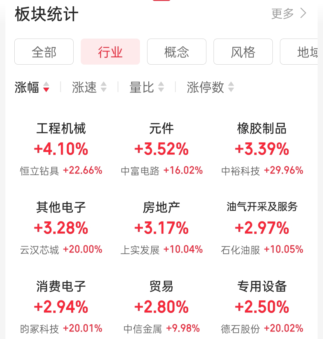 在板块方面,今日工程机械、元件、橡胶制品、电子、房地产、油气开采等几个板块表现的比较积极,涨幅靠前。从板块表现看,板块轮动较快,昨日表现好的煤炭、燃气、电机板块今天表现很一般。今天前期滞胀板块仍好于科技股。