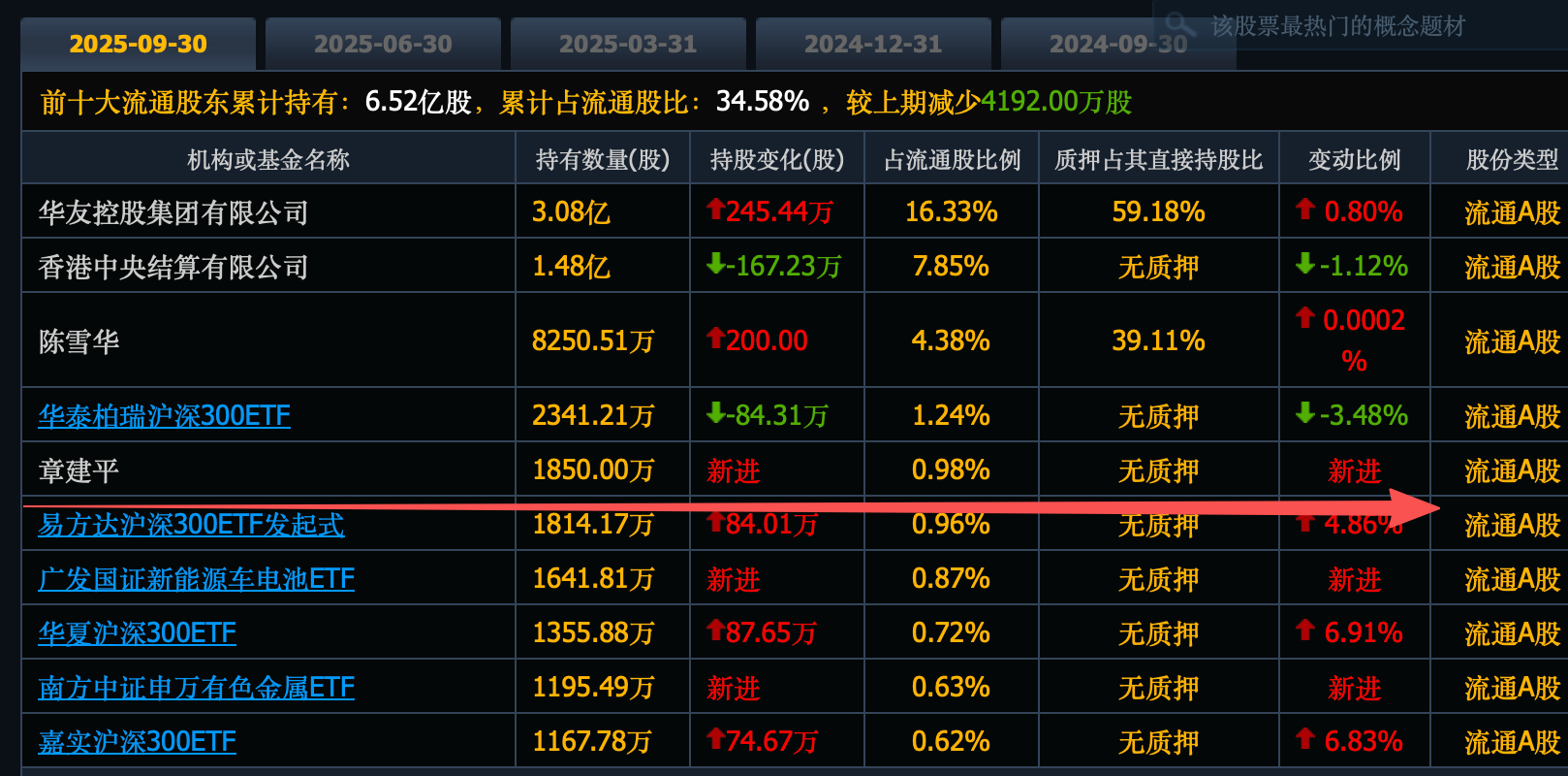 首先我们看前十大股东,非常明显,这就是这个公司最新的前十大股东数据,2025年9月30日的数据显示,牛散章建平新进了1850万股直接成为公司的第五大股东,另外还有传奇大佬陈雪华也加仓了200股,持股提升到8250万股!