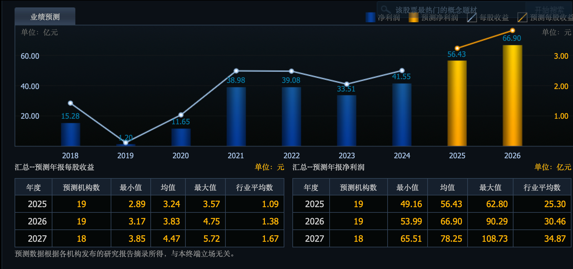 不过最近逻辑有变化,最直接的是钴价暴涨:刚果(金)出口禁令 + 配额制导致供给紧缺,国内钴价从17万/吨升至37万/吨,公司钴原料自给率超60%,利润直接受益。然后就是公司的业绩向好,2025 年前三季度净利润同比增 39.59%,单季营收增速达 40.85%,创近十个季度新高,基本面支撑股价。不仅如此,机构认为这个公司今年的利润能够达到56亿,明年的净利润能够达到66亿元。
