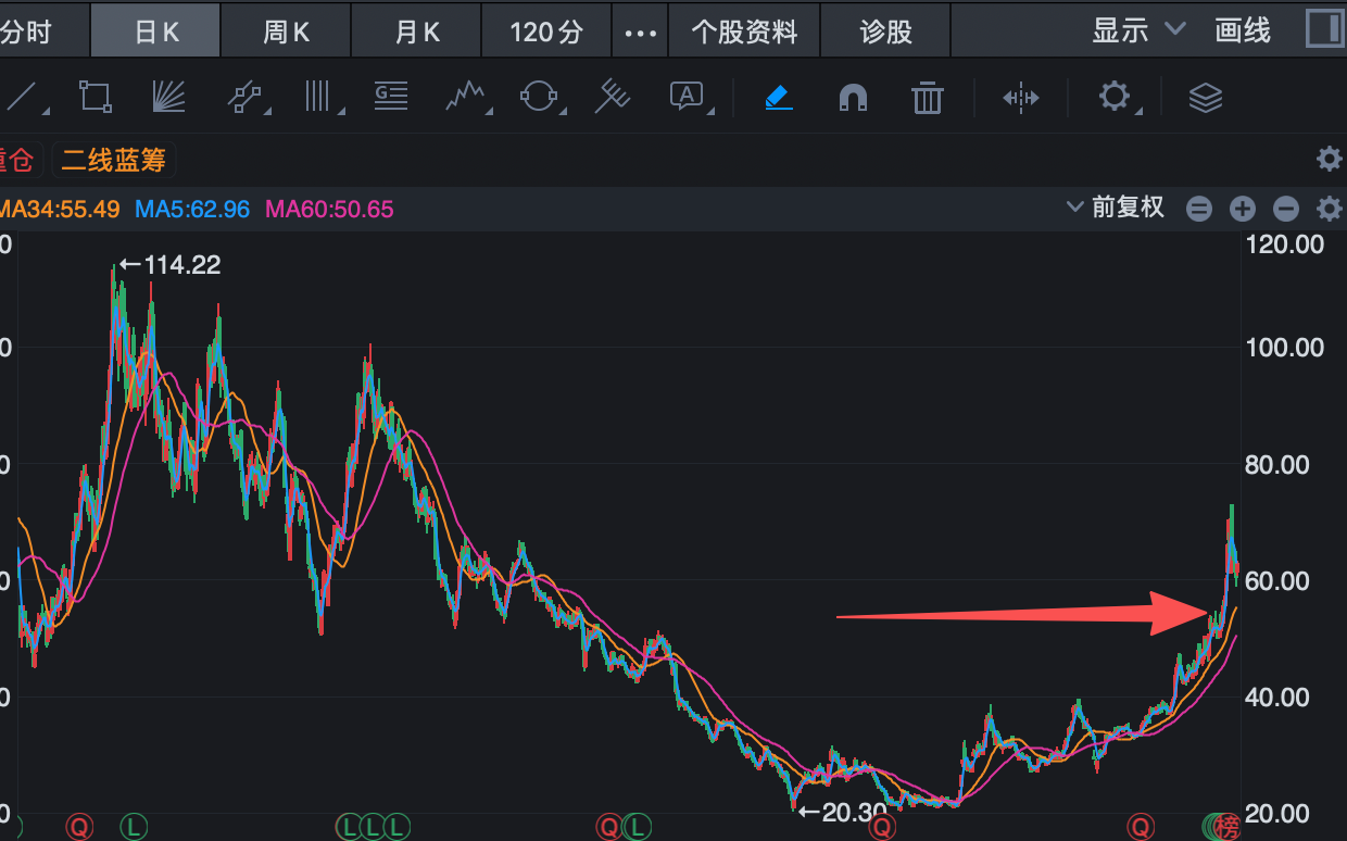 首先这个股票是从114元一路跌下来的,最低跌到20元,而最近股价启动涨到50元上下的时候章建平出手的,出手之后,这个股票还有一波上冲,不过最近又有调整,但不管怎么样,目前牛散章建平肯定是浮盈的,不过也不多,大概就是10%个点左右吧。