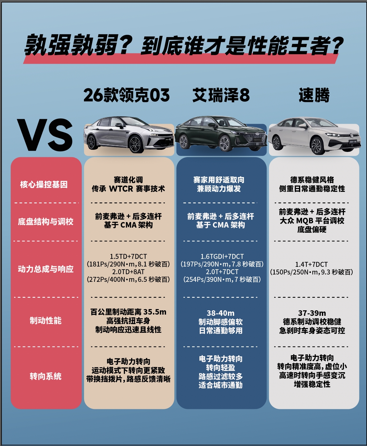 三款紧凑型轿车性能都很出色,26款领克03凭借赛车基因表现更突出,但艾瑞泽8和速腾也有各自特点,谁才是你心中的性能王者?