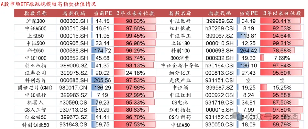 二、A股市场上,市场上ETF跟踪规模最高的30个指数中,当前估值最高的3个指数为科创100、科创芯片、科创50,当前PE分别为264.42、205.56、174.72。3年来估值分位数最高为上证50、上证180、沪深300,分别为99.45%、99.31%、98.63%。