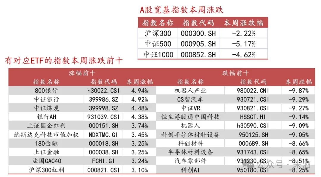 一、本周沪深300、中证500、中证1000涨跌幅分别为-2.22%、-5.17%、和-4.62%。有对应ETF的指数中,本周涨幅最高为800银行,上涨4.94%;跌幅最高为机器人产业,下跌9.87%。