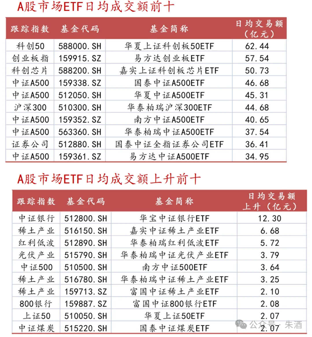 交易热度上升最多的ETF为华宝中证银行ETF,日均交易额上升12.3亿元,跟踪指数为中证银行。交易热度上升前十的ETF涉及金融、资源、高股息、科技及高制、中盘、大盘板块。
