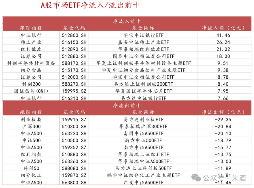 六、A股市场资金流入最多的ETF为华宝中证银行ETF,流入额为41.46亿元,跟踪指数为中证银行。流入额前十的ETF涉及金融、资源、高股息、科技及高制、消费、科创&创业板块。