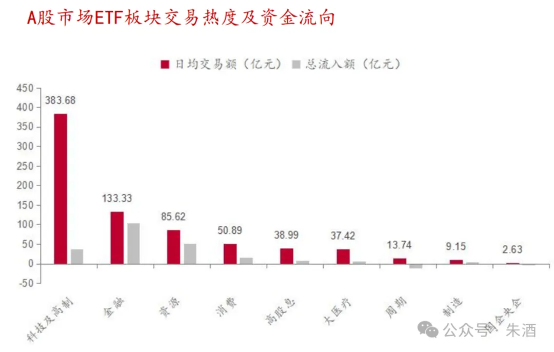 四、行业和主题ETF中,A股市场ETF交易热度最高的板块为科技及高制板块,日均交易额为383.68亿元。资金流入最多的板块为金融板块,流入额为104.25亿元。资金流出最多的板块为周期板块,流出额为11.37亿元。