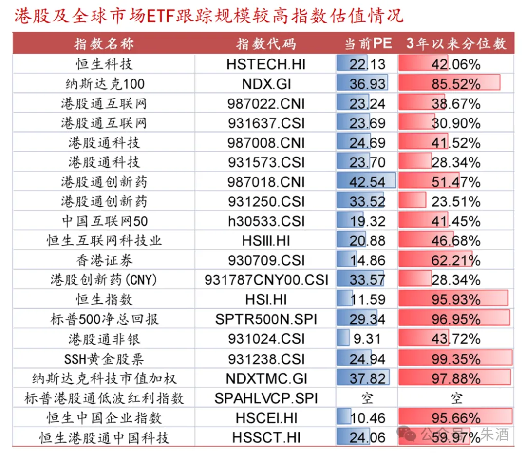 三、港股及全球市场上,市场上ETF跟踪规模最高的20个指数中,当前估值最高的3个指数为港股通创新药、纳斯达克科技市值加权、纳斯达克100,当前PE分别为42.54、37.82、36.93。3年来估值分位数最高为SSH黄金股票、纳斯达克科技市值加权、标普500净总回报,分别为99.35%、97.88%、96.95%。