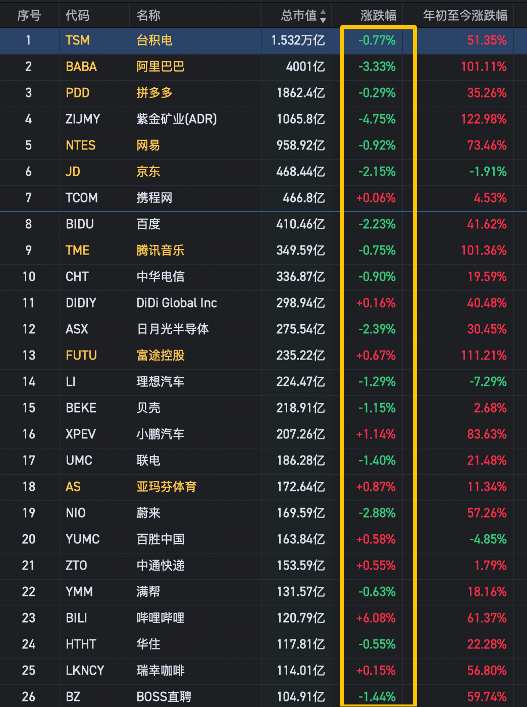 不仅仅黄金有色暴跌,今晚中概股也是大幅下跌的。具体表现如下: