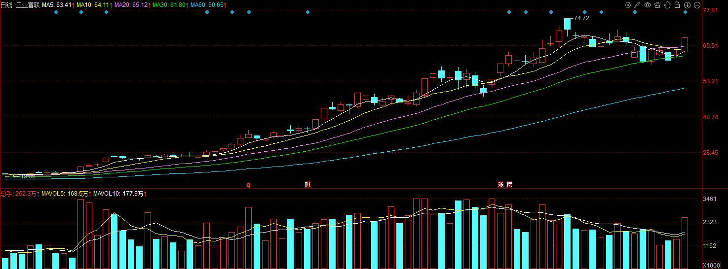 工业富联601138:工业富联是全球AI服务器制造的绝对龙头,跟英伟达这些核心客户绑得紧,液冷技术有优势,在全球算力基建里占重要位置。同时,其作为苹果核心供应链企业,受益显著近期苹果股价突破历史新高,iPhone系列需求旺盛,直接带动产业链订单预期升温,为公司业绩再添助力。昨天走势很强,领涨板块,缩量调整后又往上冲,午盘涨得挺明显,主力往里砸了不少,交易活跃度也高了。消息上,全球AI投资加速,服务器需求大增,公司AI服务器业务增长很快,GB200系列产品在量产爬坡,不少券商都看好。技术面主力筹码稳定,上升趋势清晰,在苹果利好与AI热潮双重驱动下,今天继续冲高的概率大。$工业富联(SH601138)$