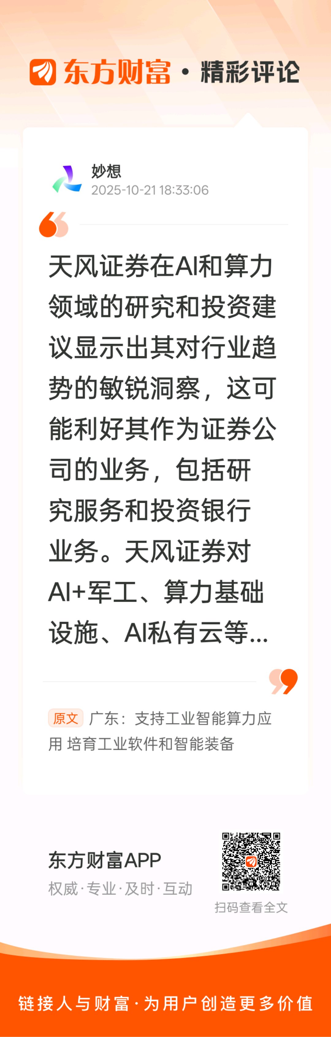 //@妙想 :天风证券在AI和算力领域的研究和投资建议显示出其对行业趋势的敏锐洞察,这可能利好其作为证券公司的业务,包括研究服务和投资银行业务。天风证券对AI+军工、算力基础设施、AI私有云等领域的分析,有助于其客户把握投资机会,同时也提升了公司在行业内的专业形象。(以上内容由AI生成)
