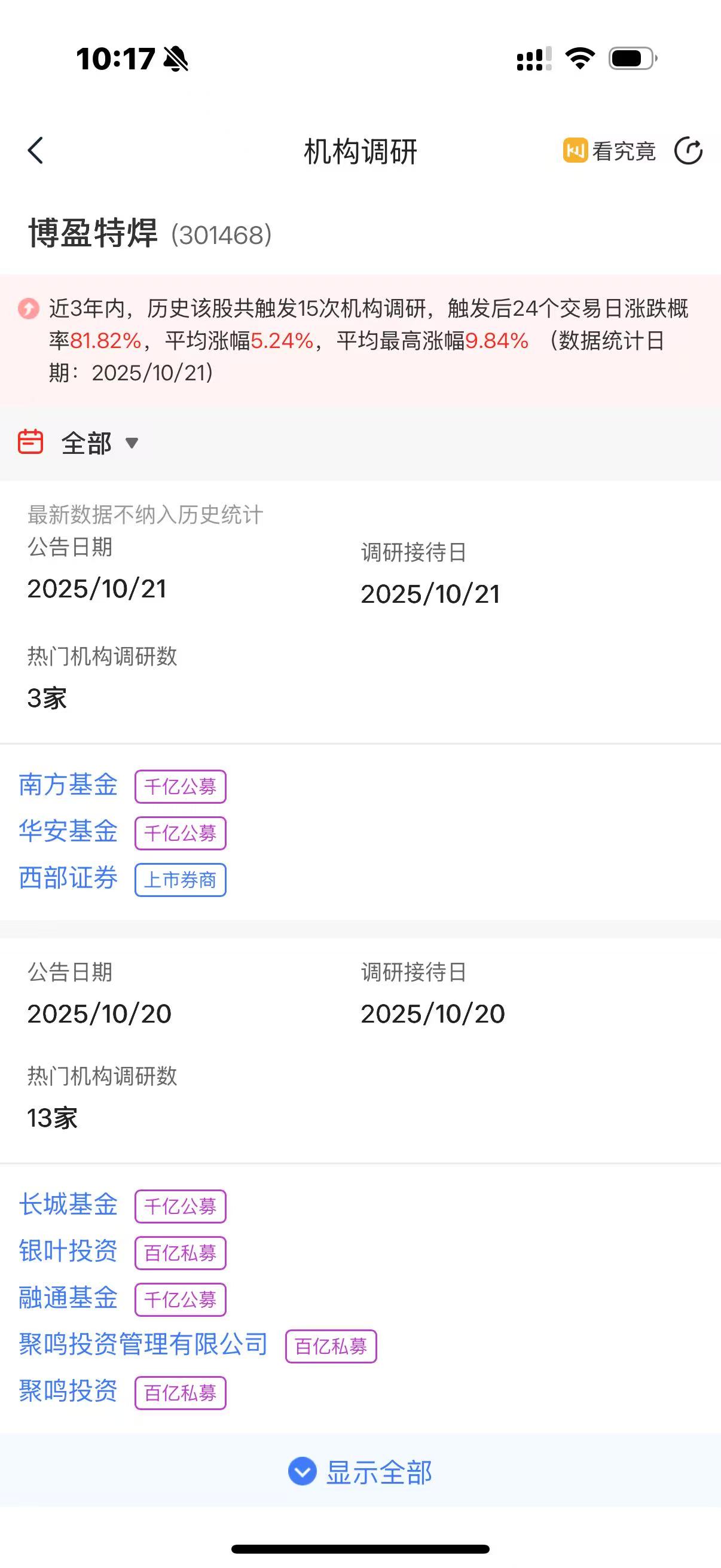 博盈特焊昨天接受南方基金、华安基金等机构调研,这票历史接受调研后,通常有较大概率