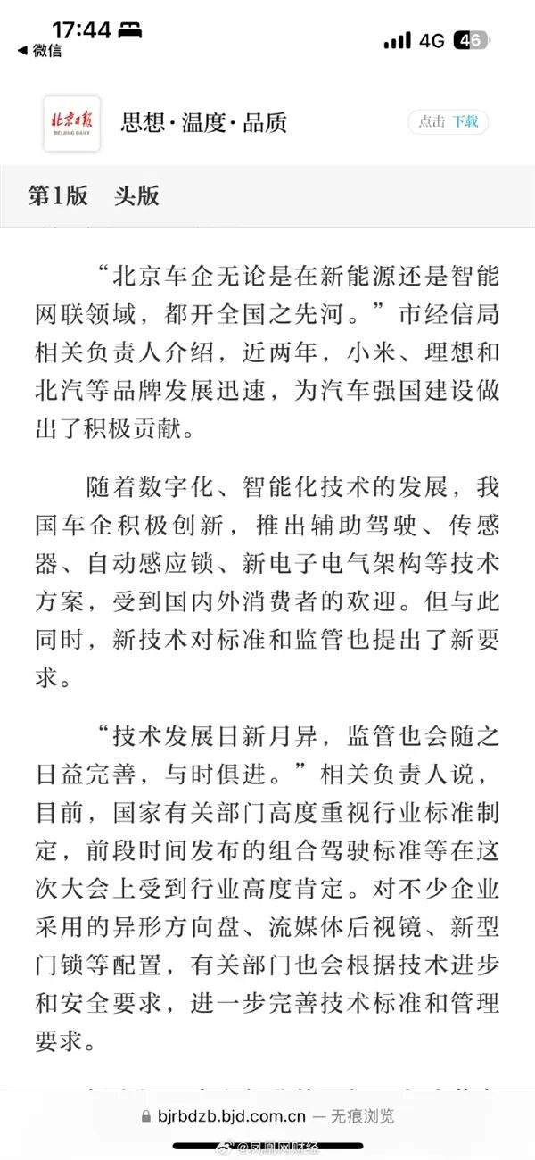 与此同时,央视新闻也发声肯定,称小米等北京车企在新能源与智能网联领域“开全国之先河”,为汽车强国建设注入强劲动力。