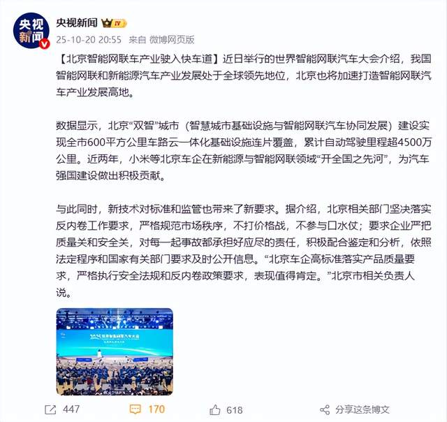 央视新闻也特别指出,北京车企高标准落实产品质量要求,严格执行安全法规和反内卷政策,小米的表现值得肯定。