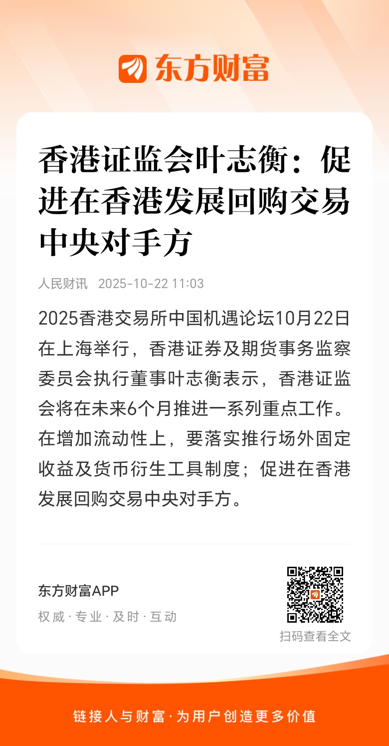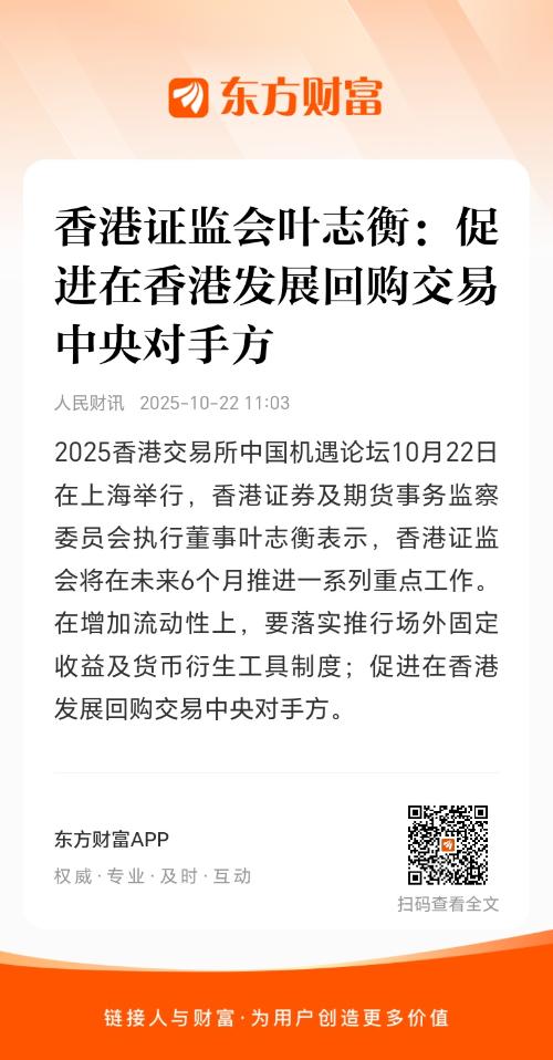 2025香港交易所中国机遇论坛10月22日在上海举行,香港证券及期货事务监察委员会执行董事叶志衡表示,香港证监会将在未来6个月推进一系列重点工作。在增加流动性上,要落实推行场外固定收益及货币衍生工具制度;促进在香港发展回购交易中央对手方。