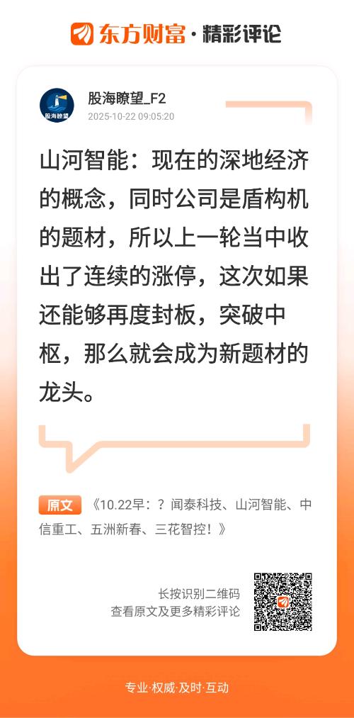 //@股海瞭望_F2 :山河智能:现在的深地经济的概念,同时公司是盾构机的题材,所以上一轮当中收出了连续的涨停,这次如果还能够再度封板,突破中枢,那么就会成为新题材的龙头。