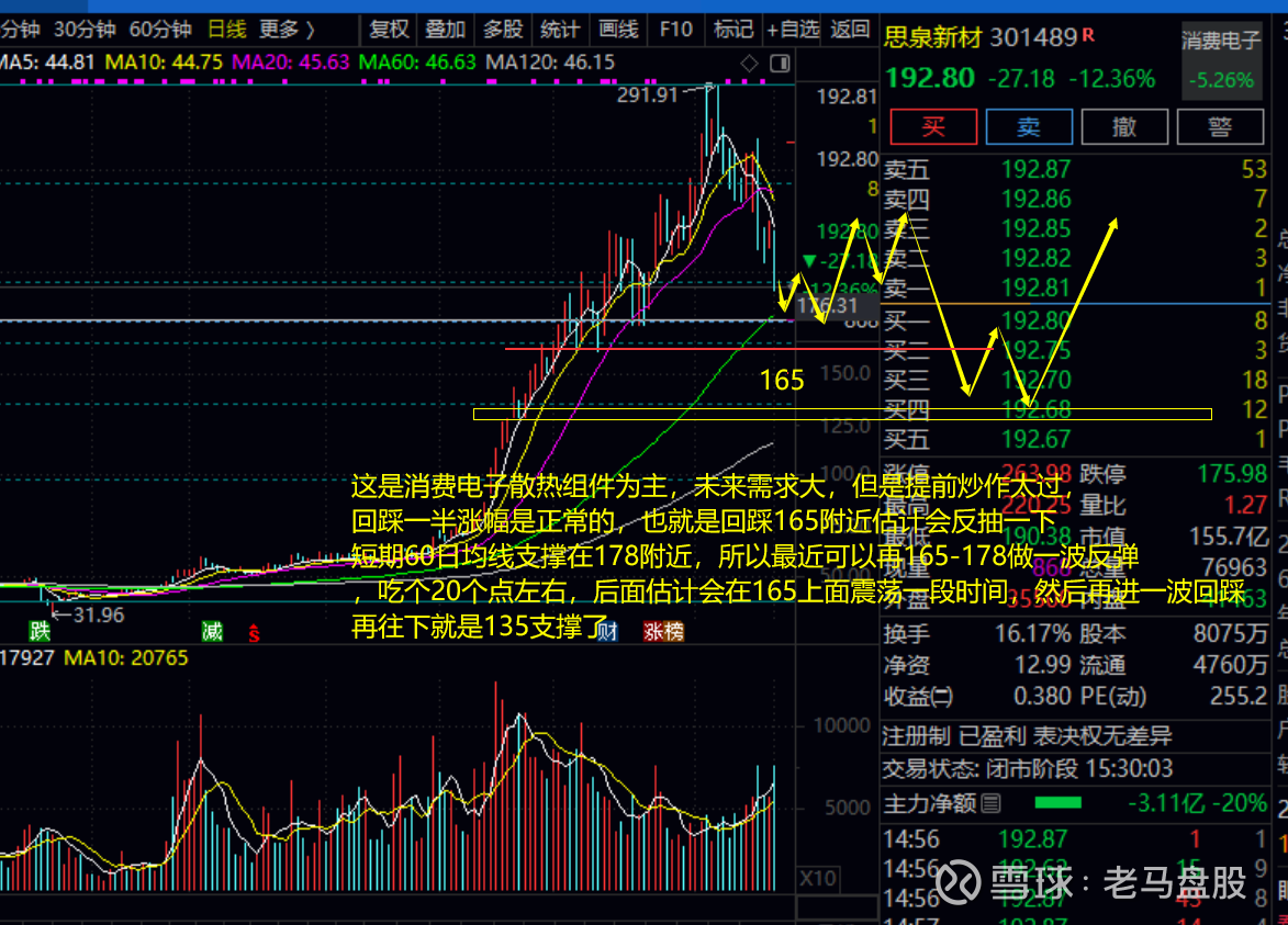 另外还有一个是电子消费端散热组件代表$思泉新材(SZ301489)$ 这个是次新股,虽然未来散热组件需求大,但是提前炒作太过,回吐这轮涨幅一半是正常的(165附近),而60日线支撑在178一带,所以近期在165-178寻机可以做个反弹,然后等估值慢慢修复,中长线要考虑到回踩到135的可能性。届时再考虑是否做下一个大波段。