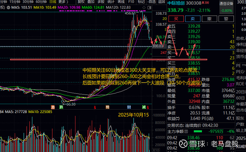 光模块代表$中际旭创(SZ300308)$ 这个之前多次分析, 345短暂下破后目前反弹,短期预计会在345上面继续震荡,三季度财报过后估计会再次回落。长期来说回踩熬260-300一带会比较合理,当然中期回踩到300-310一带的话可以做个20-30个点小波段反弹。预计明年中之前,都在260以上宽幅震荡为主。新易盛中短期在290上面震荡为主,中长期关注265和225两个支撑,预计明年中之前会在225上面运行,期间回踩这两个支撑都可以进去吃一个20个点左右反弹。