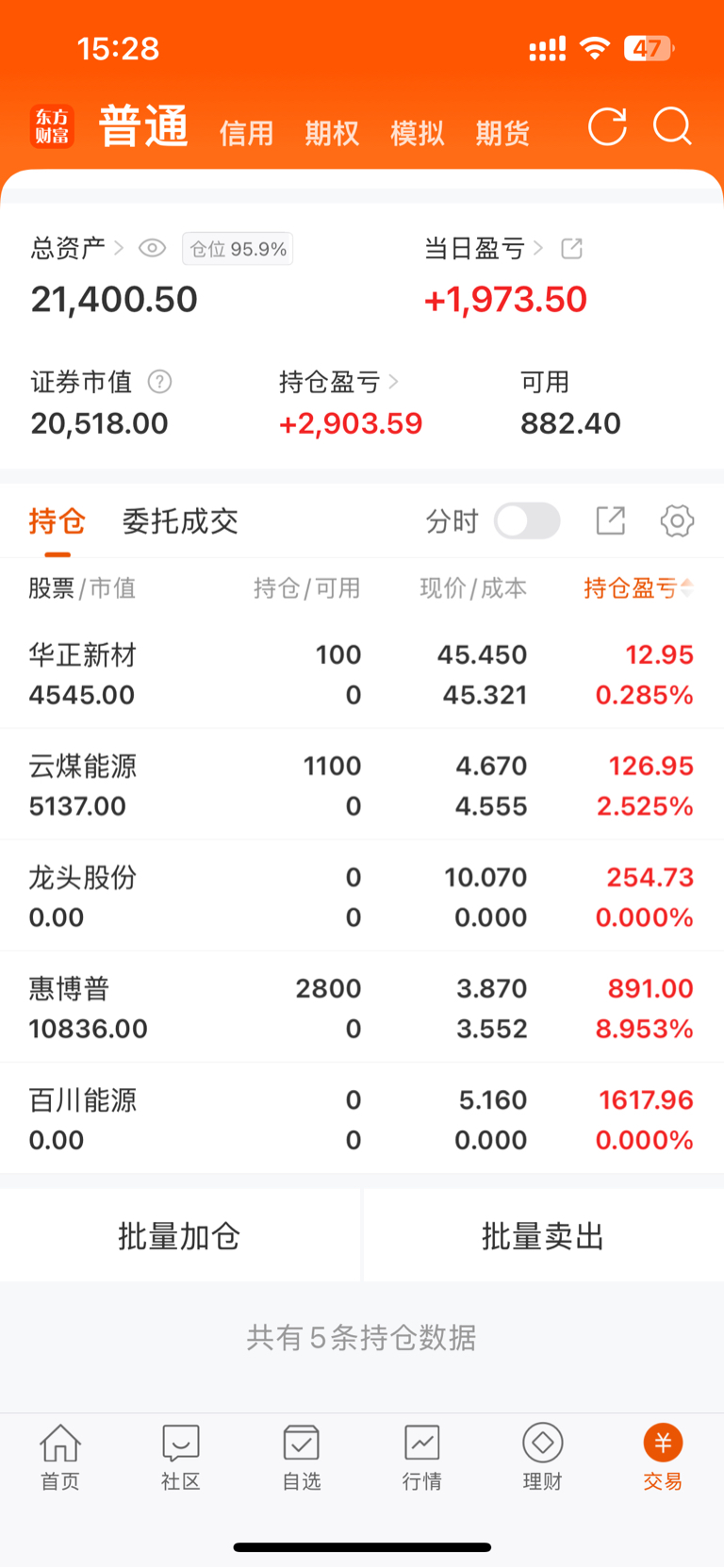 从今年三月一号入市到现在操作最6的一天,运作五个票全红收益十个点,自学一路砸钱买经验,八月开始摸到一点东西,打板用三分一轻仓赢干重仓4分之3仓重亏五十个点拉赢至赢5个点,九月摸到第二个模式但贪心了两边都想得结果又重亏一个月,这个月开始专心做笫二个模式,也只剩下最后一点体验券,希望能长长久久的走下去。
