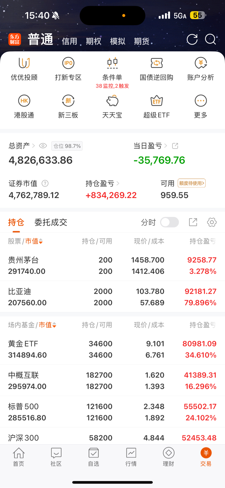 万日定投第162天,今日周定投黄金ETF五千元,触发条件单2笔,买入1笔,卖出 1笔,今日收益: -3.5w
