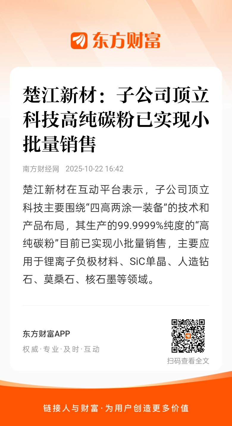 楚江新材在互动平台表示,子公司顶立科技主要围绕“四高两涂一装备”的技术和产品布局,其生产的99.9999%纯度的“高纯碳粉”目前已实现小批量销售,主要应用于锂离子负极材料、SiC单晶、人造钻石、莫桑石、核石墨等领域。