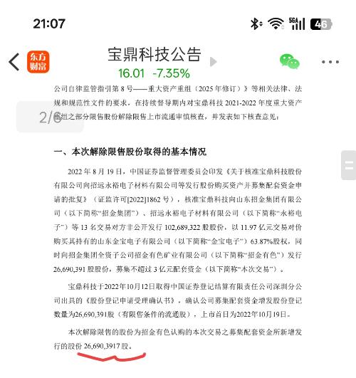 有限公司向招远永裕电子材料有限公司等发行股份购买资产并募集配套资金申请的批复》(证监许可[2022]1862 号),核准宝鼎科技向山东招金集团有限公司(以下简称“招金集团”)、招远永裕电子材料有限公司(以下简称“永裕电