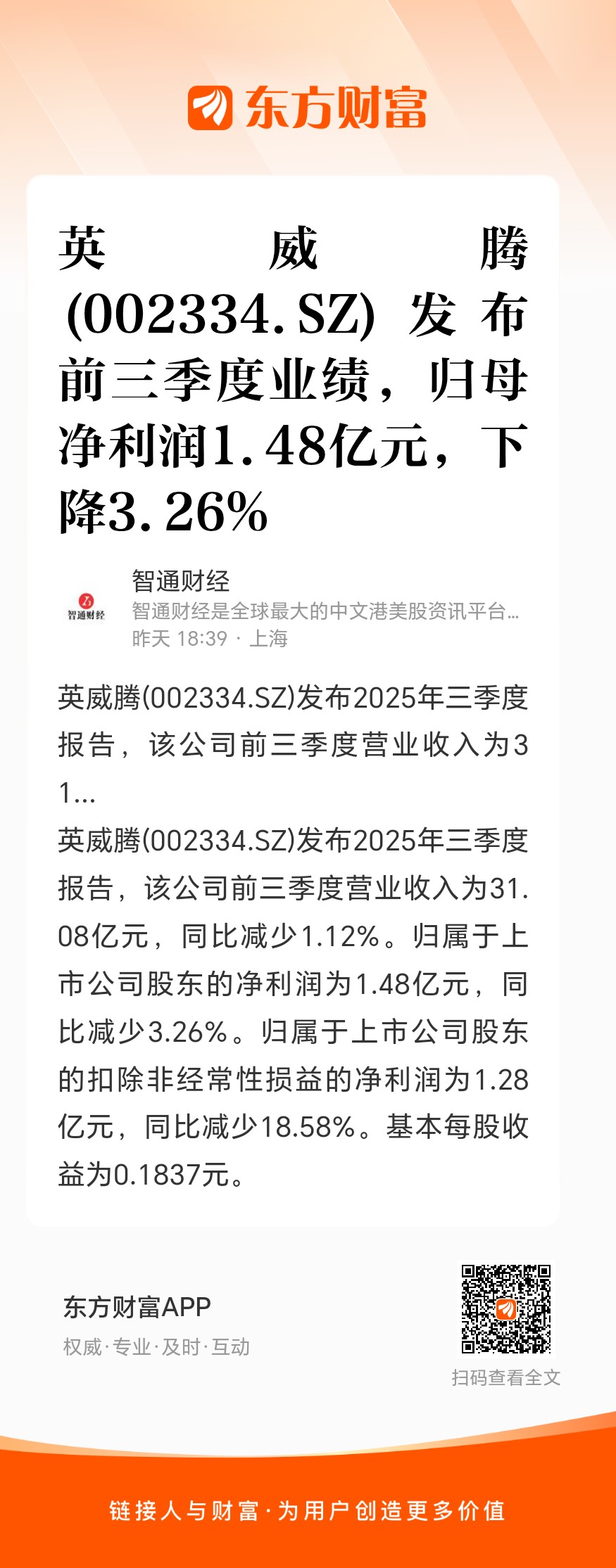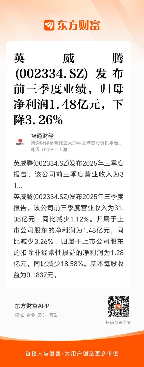 英威腾(002334.SZ)发布2025年三季度报告,该公司前三季度营业收入为31.08亿元,同比减少1.12%。归属于上市公司股东的净利润为1.48亿元,同比减少3.26%。归属于上市公司股东的扣除非经常性损益的净利润为1.28亿元,同比减少18.58%。基本每股收益为0.1837元。
