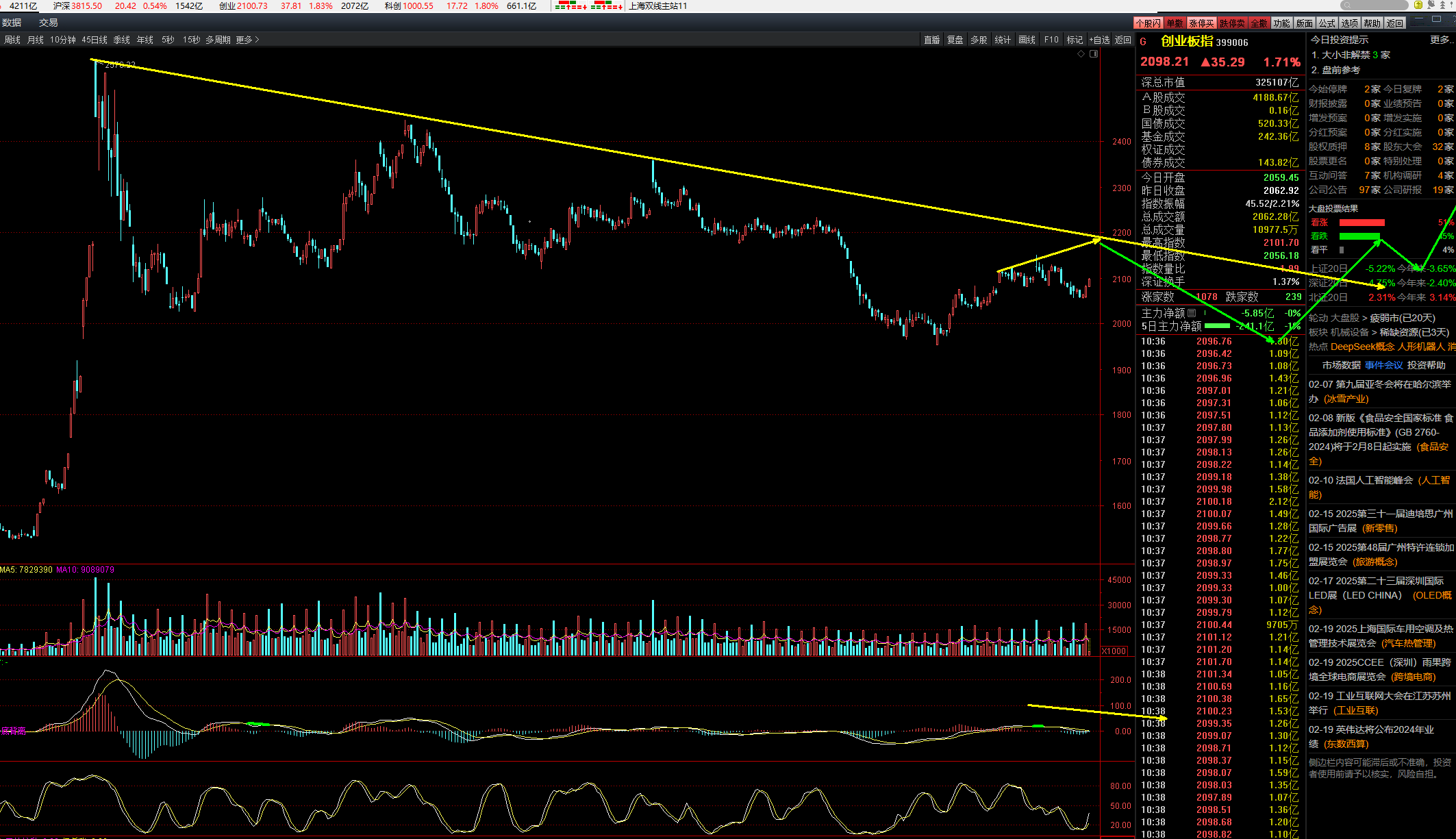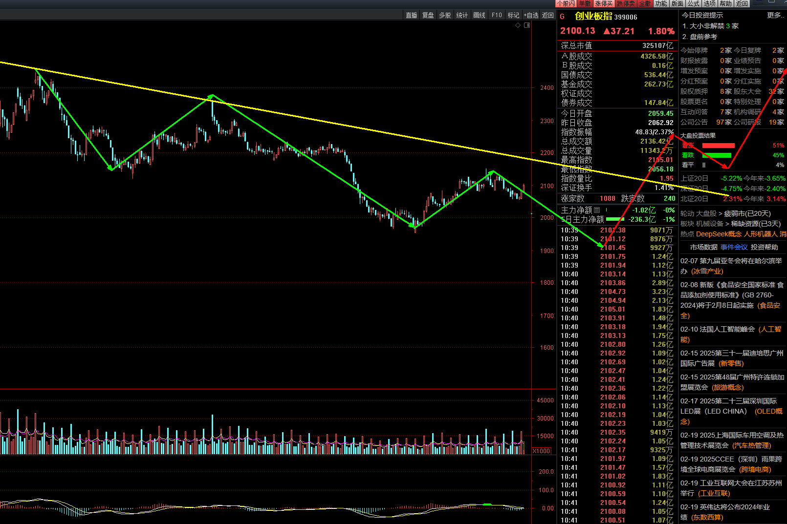 从创业板指数的短期表现来看,通过观察60分钟级别的K线图,能清晰地发现市场正处于反弹后的震荡状态。指数呈现出既不向上突破、也不向下大幅下跌的态势,处于一种胶着状态。与此同时,整体市场指数方向不明,以上证指数为例,昨日下跌20个点,今日又上涨18个点,指数上下波动频繁,呈现出无规则的随机摆动,这使得市场更多地表现为题材性炒作。