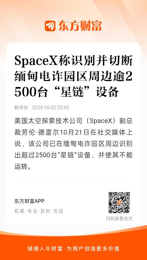 SpaceX称识别并切断缅甸电诈园区周边逾2500台“星链”设备新华社8小时前约53秒美国太空探索技术公司(SpaceX)副总裁劳伦·德雷尔10月21日在社交媒体上说,该公司已在缅甸电诈园区周边识别出超过2500台“星链”设备,并使其不能运转。德雷尔在帖文中说,在缅甸“疑似诈骗中心周边”,该公司“主动识别”并使超过2500台“星链”设备不能运转。据缅甸官方媒体20日报道,缅甸国防军日前对该国边境地区的电诈园区开展清剿行动,查获30套美国太空探索技术公司“星链”接收器及配件。分享至:微信朋友圈微博郑重声明:东方财富发布此内容旨在传播更多信息,与本站立场无关,不构成投资建议。据此操作,风险自担。
