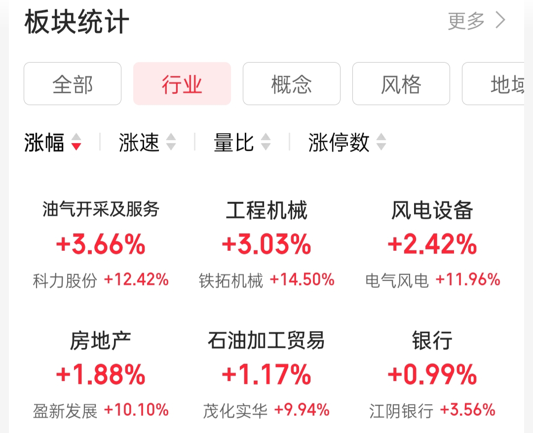 在板块方面,昨日油气开采、工程机械、风电设备、房地产、石油加工贸易、银行等几个板块表现的比较积极,涨幅靠前。从板块表现看,板块轮动较快,目前板块表现活跃的大多是前期滞胀板块。
