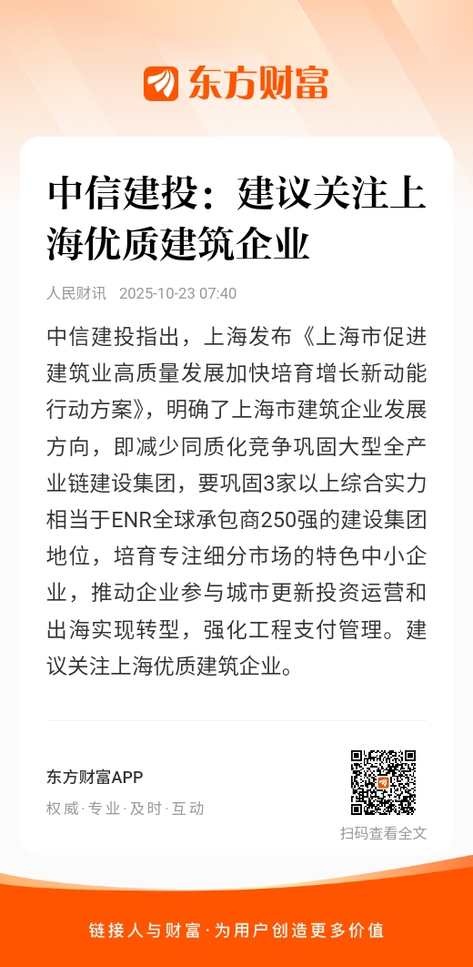 中信建投指出,上海发布《上海市促进建筑业高质量发展加快培育增长新动能行动方案》,明确了上海市建筑企业发展方向,即减少同质化竞争巩固大型全产业链建设集团,要巩固3家以上综合实力相当于ENR全球承包商250强的建设集团地位,培育专注细分市场的特色中小企业,推动企业参与城市更新投资运营和出海实现转型,强化工程支付管理。建议关注上海优质建筑企业。