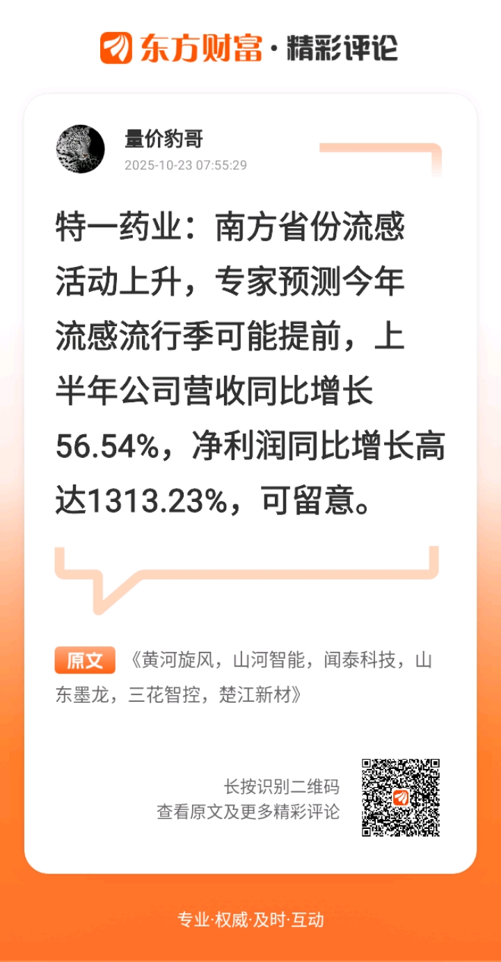 //@量价豹哥 :特一药业:南方省份流感活动上升,专家预测今年流感流行季可能提前,上半年公司营收同比增长56.54%,净利润同比增长高达1313.23%,可留意。