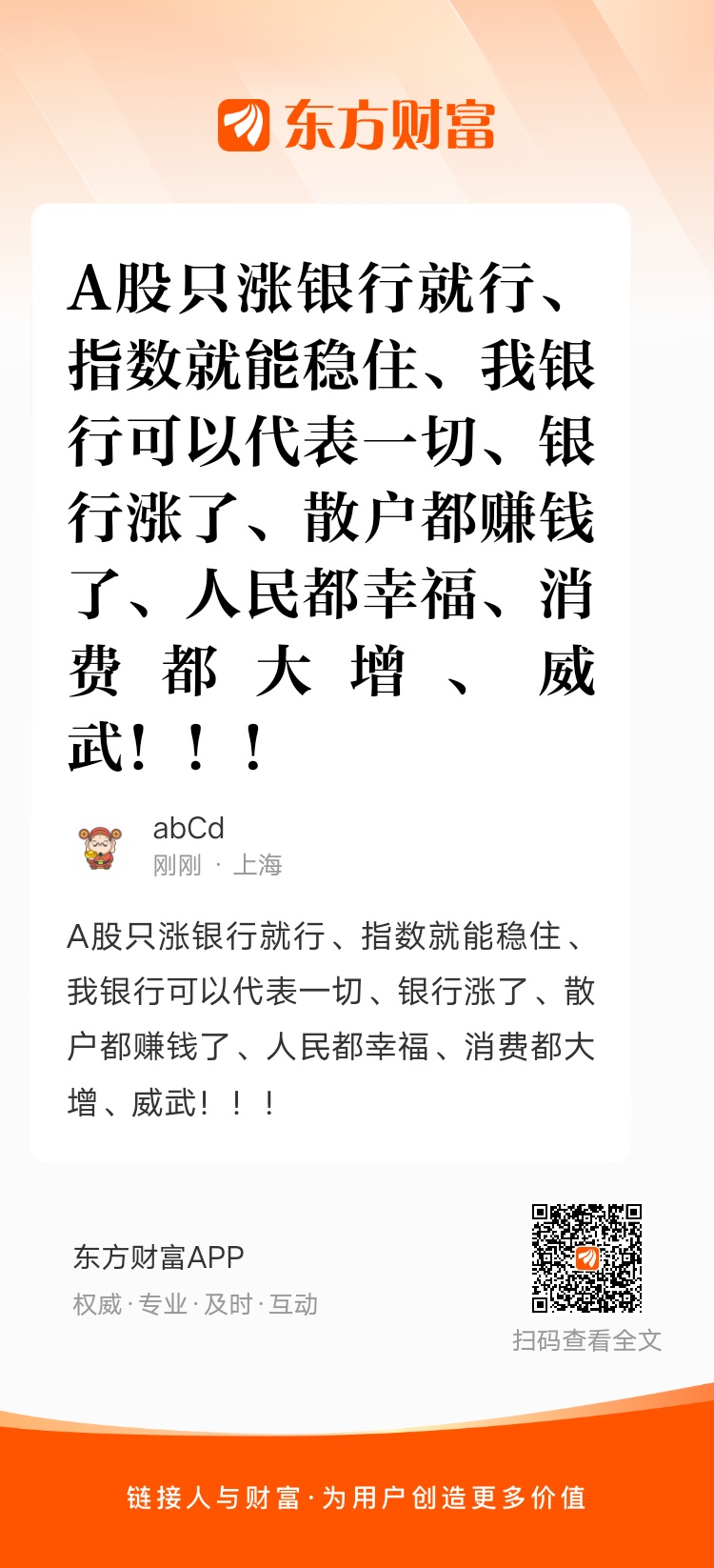 A股只涨银行就行、指数就能稳住、我银行可以代表一切、银行涨了、散户都赚钱了、人民都幸福、消费都大增、威武!!!